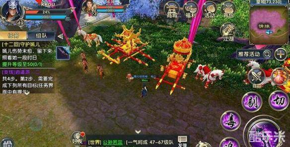 结婚时间一到,夫妻进入巡游模式。男生变成新郎,骑着骏马走在前面,身后跟着奏乐队伍和新娘的大红花轿,其它玩家则在最后面跟着。