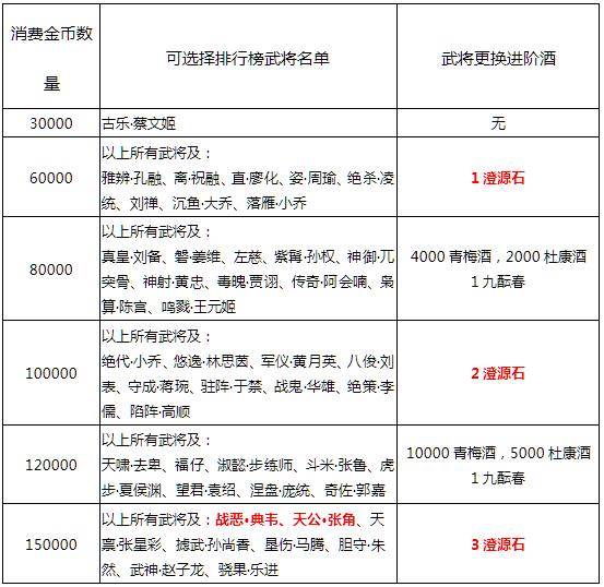 1、活动期间,累计消费金币数量达到对应金额,可以联系在线客服申请1个排行榜武将奖励,或对应金额的进阶酒或橙源石奖励;