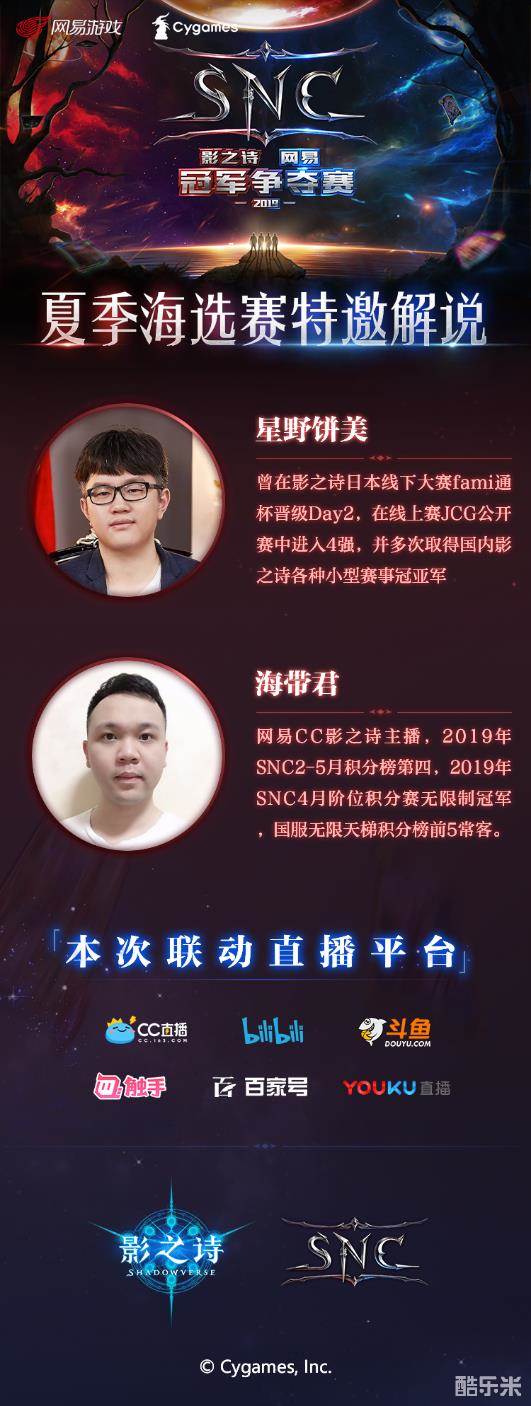 《影之诗》国服最高级别的赛事、贯穿全年的赛程、愈加紧张刺激的对战,《影之诗》SNC期待你的关注!高手频频对决,谁将成为最后的四强勇士?大奖触手可及,谁将摘得最高的赛事奖励?更多激烈对抗将在比赛中上演,更有专业解说深入分析!观众可以在比赛日前往CC直播、bilibili、斗鱼直播、触手直播和优酷直播等直播平台观看比赛,更多SNC赛事的相关资讯请见赛事官网!