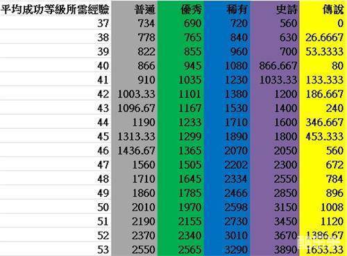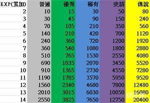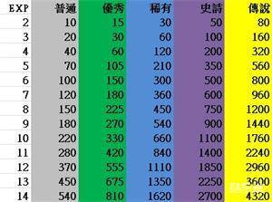 结论:以普通为基準,各个稀有度所需经验值分别为(1.5/3/5/8)倍