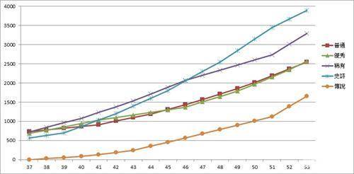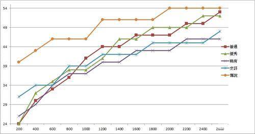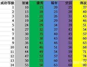 图叁为各个稀有度在相对等及提供的100%成功等级