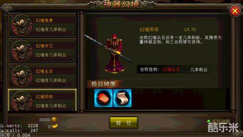 神器幻境中共有5种怪物,每次刷新1只怪物。击败后刷新下一只。每个完整的副本刷新共70只怪物。击杀怪物后掉落进阶功能必需的装备碎片及图纸。