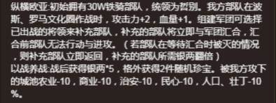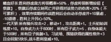 3.战斗力加成:2攻击1移动(基本等于骑兵营),没有什么软磨硬泡的防御血量,咱就是要推!面板的11+2+中央将军1就可以达到14攻击,更不要提还有之后的卡包配合。还有首创的攻击距离+1让我们可以隔山打牛打到甚至不交界的城池,大大减少的绕路所需要的时间,后期难磨的波斯罗马再送一个攻击+2,血量+1。 这些还不够,由于俘虏地方将领的概率大大增加,我们只需要在战后轻轻点下祭旗按钮,伤害还能再加20%(折算一下大约相当于+3的攻击力)我已经不知道该怎么吹了!