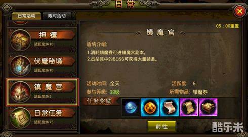 玩家等级达到38级时可前往蛮荒沙城中心区域npc“镇魔宫”处挑战镇魔宫。每次挑战将消耗数个镇魔券,镇魔券可在商城中进行购买,难度越高的Boss消耗的镇魔券越多。每完成1次挑战,可获得大量奖励及5点日常活跃度。