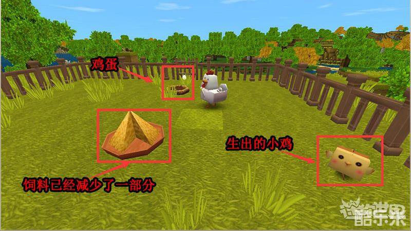 我们需要把鸡饲料和鸡窝摆放在鸡的附近,为了方便管理我们可以用木围栏围起来,我们如果手上拿着鸡饲料鸡就会跟着你走,用这种方法可以很容易把鸡引导到围栏中:然后我们稍等一会,鸡就在鸡窝处产出鸡蛋啦,还生下了一个鸡宝宝哦~