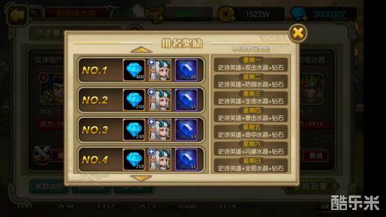 根据排名每隔一段时间会立出对应的金币,金币可以在金币商人处兑换奖励,并且每日发放排行奖励,排名奖励能获得养成道具和大量英雄碎片、钻石哦!