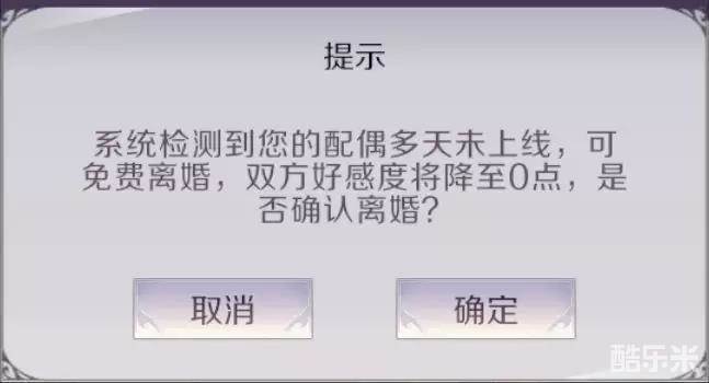 如果配偶5天以上没有上线,另一方可免费申请强制离婚,离婚后双方好感度清零。