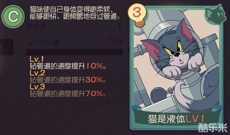 生活中,想必你已对猫咪轻松穿过远比自己身躯要小的洞的场景见怪不怪,这可不是因为猫咪“虚胖”,而是因为“猫是液体”!游戏中,玩家为猫咪配置该知识卡后,可以使其身体更加柔软,在穿越管道时更加迅速,最高可提升穿越管道速度50%!