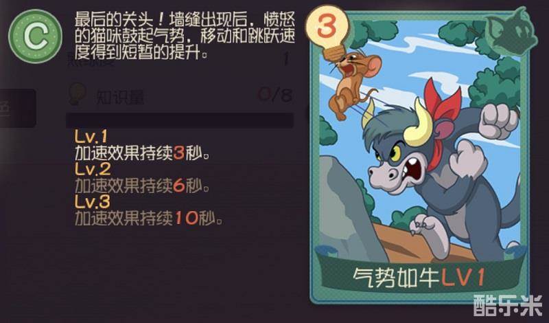 看惯了猫咪的高冷和软萌,可千万别忘了它也是一等一的捕猎高手!“气势如牛”知识卡能够让猫咪在墙缝出现后的最后关头进入愤怒状态,移动和跳跃速度得到短暂的提升,加速效果最多可持续10秒,能否翻盘,就看这最后关头了!