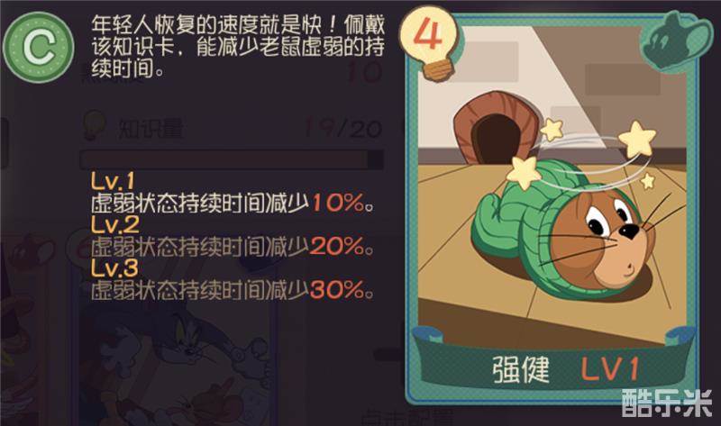 间不容发的猫鼠追逃考验的不仅是智慧和技巧,还有双方的体力,知识卡“强健”就能让小老鼠们更加年轻态,减少虚弱状态的持续时间,避免被猫咪捕获。
