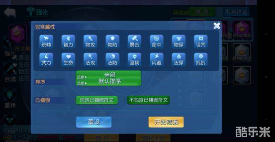 如果主公的符文太多,挨个查找比较麻烦,小编推荐大家使用符文的筛选系统!主公之需要点击右上方的【筛选】按钮,便可进入筛选界面。在筛选界面中,主公可以根据符文包含的属性、排序、已镶嵌符文等条件,快速的找到自己想要的符文!