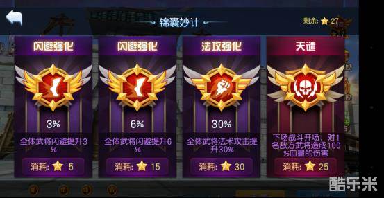 锦囊妙计可以临时增强武将属性,持续至本次过关斩将通关为止。锦囊妙计每三关会出现一次,每次出现会有4个选项由主公选择,其中有三个是普通属性强化,另一个则是炼狱选项,效果远比普通强化给力。至于这些锦囊妙计的属性,则是从左到右越来越强,价格也是如此。