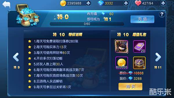 另外,还有一个小秘密要告诉大家!主公们虽然每天只有三次购买体力的机会,但是可以通过提升特权等级来增加每日购买体力的次数哦。比如说特权10,每天购买体力的次数就高达13次!此外你不仅会享受到一系列的额外特权,还可以将神将吕布收入麾下,有没有觉得超级划算呐!并且在本次测试进行的充值都会在游戏首发时以钻石形式双倍返还!