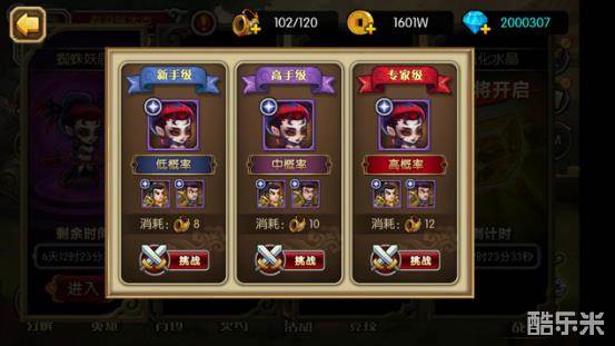 活动副本分为新手级、高手级、专家级,分别有3、4、5关,必须连续击败对方3、4、5波敌人才能获胜。