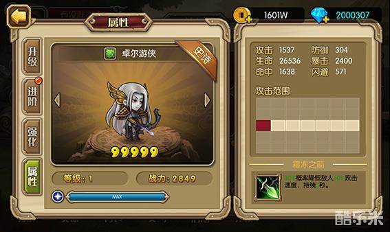 卓尔游侠最突出的属性是暴击,配合上她不俗的攻击力,可以在对战中快速击杀敌人,但可惜的是她的防御和闪避属性偏低,这会让卓尔游侠在战场的生存力变得很低。卓尔游侠的属性注定了她是一个躲在暗黑中的杀手,同时她的“霜冻之箭”技能还能降低敌人的攻击速度,减少敌方输出。