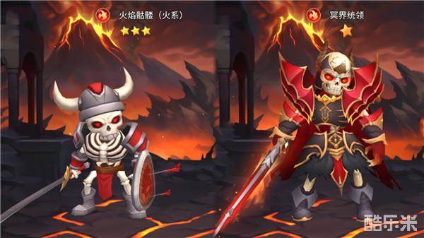 火焰骷髅和冥界统领都是来自火系阵营,火焰骷髅从小就立志要成为一名优秀的士兵,他最希望的就是可以变成他的偶像,也就是冥界统领。虽然火焰骷髅现在的战斗姿势还不是很完美,但是拿剑的气势已经和冥界统领有几分相似了呢!