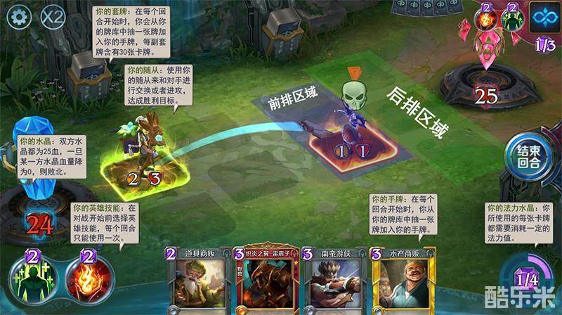 对战区域分为前排(两个)和后排(三格),前排随从自带嘲讽属性(对手无法越过前排直接攻击后排随从和水晶,远程英雄除外),后排随从不具有嘲讽属性,对手可以选择性攻击后排随从或者水晶。