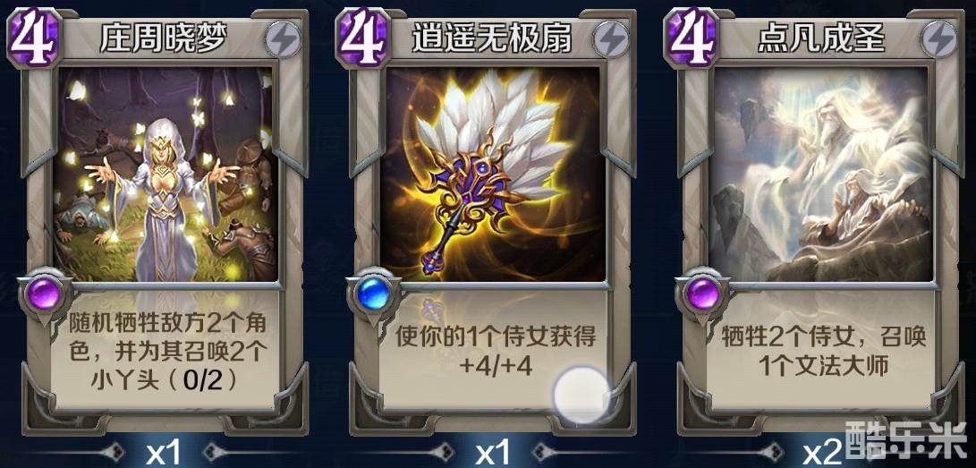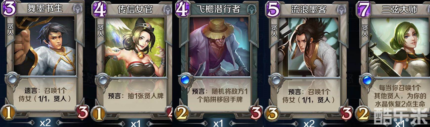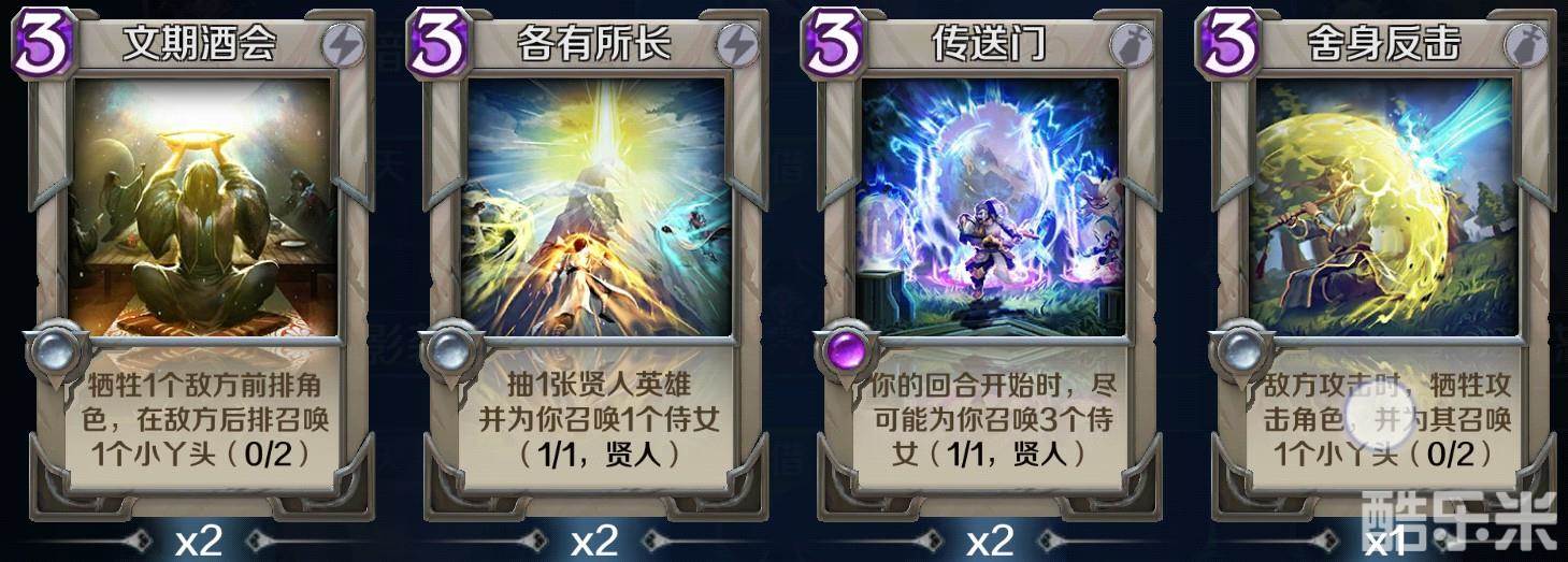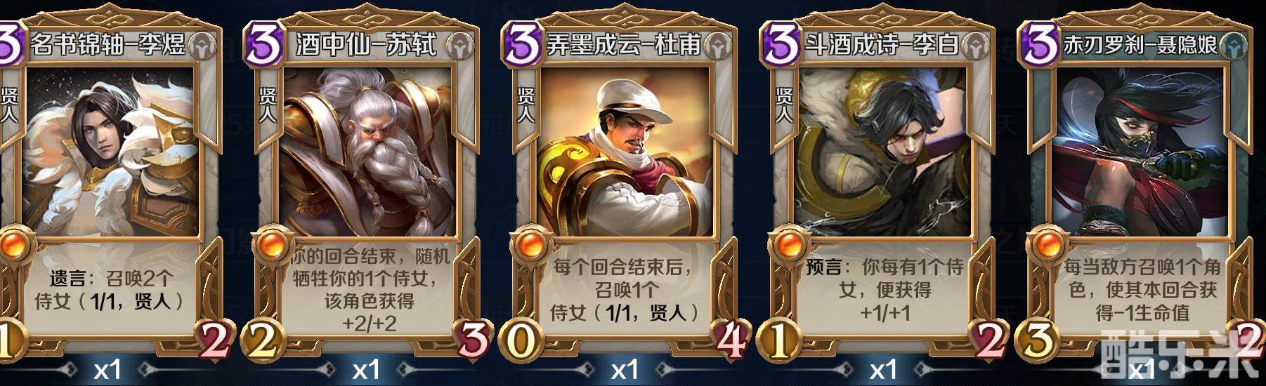 杜甫以及各种召唤侍女的名卡,这套卡组的强力角色很多,但是核心其实是侍女。如果被聂隐娘克制的话就会毫无办法,所以一定要防一手聂隐娘。杜甫如何能够成功站场的话,强力的铺场能力就能够完全显现,对手只能慢慢的享受死亡