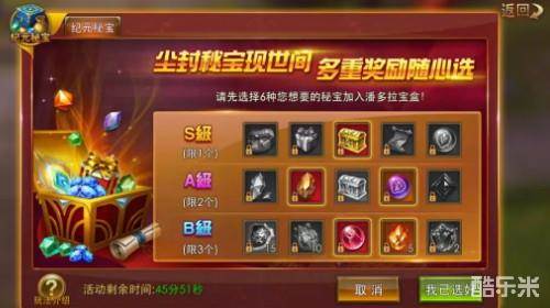 尘封秘宝现世,多重奖励随心选!勇士可从推荐的宝物中选择6种想要的加入到潘多拉宝盒。