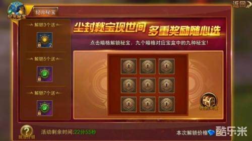 永恒纪元纪元秘宝是小编为大家带来的,宝盒共有9个暗格,除了自选的6种宝物外,还有3种默认宝物。消耗钻石即可开启暗格获得里面的宝物,当累计开启了3个、5个和7个暗格时均可以领取一份额外奖励。