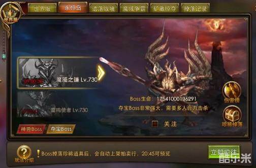每天20:30永恒岛会刷出一批夺宝BOSS,需多人合力击杀。击杀Boss后会爆出大量的无主物品,玩家可自由拾取。