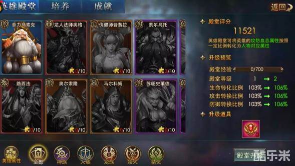 属性转换:英雄殿堂可将所有解锁英雄的攻防血总属性根据一定比例转化为人物的对应属性。