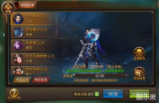 1、每次挑战成功或扫荡可增加该副本的熟练度,熟练度越高挑战副本越容易掉落英雄碎片。