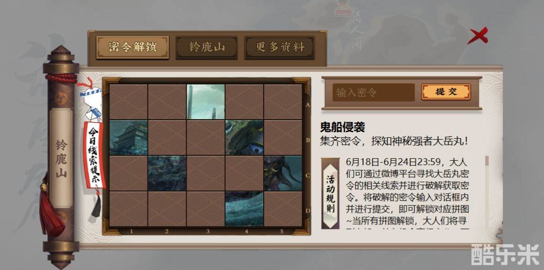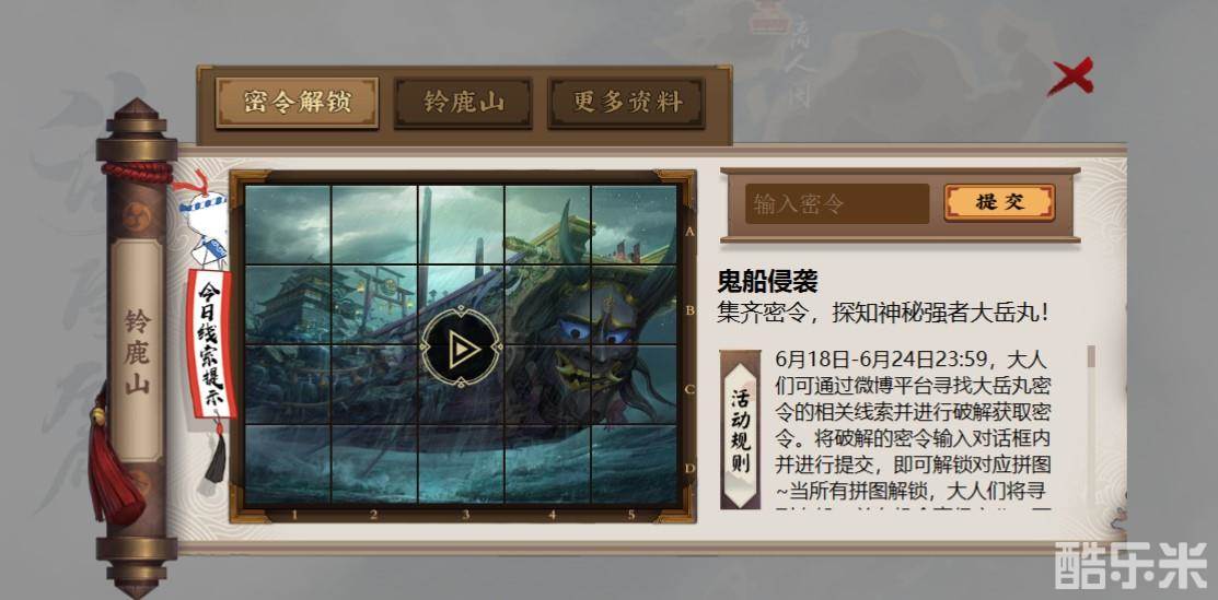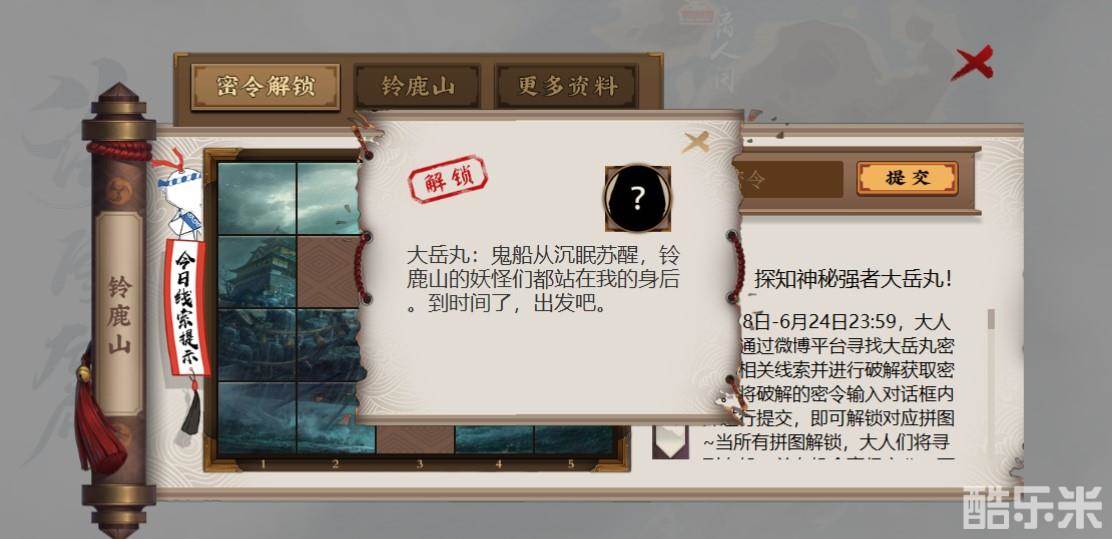 6月18日-6月24日23:59,大人们可通过微博平台寻找大岳丸密令的相关线索并进行破解获取密令。当所有拼图解锁,大人们将寻到鬼船,并有机会赢得宝藏。