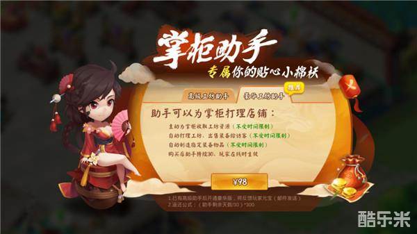 经商助手分为两档,高级工坊助手和豪华工坊助手。高级工坊助手为30一个月,其功能有: