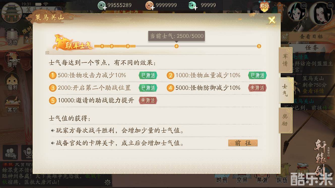 行军打仗讲究士气,全服联军士气每积攒到一定数值,都将激活指定效果,助力联军沙场征伐。其中,不仅包括怪物的攻击力、血量、防御等数值降低,还能开启助战位置,甚至提升助战能力。