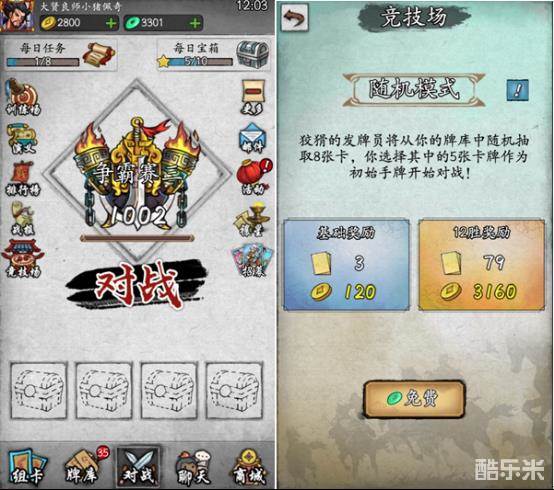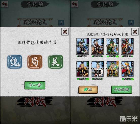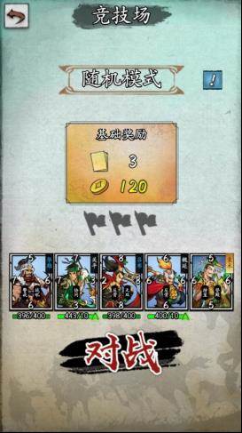 在“竞技场随机模式”中,玩家需从魏蜀吴三大势力选择一个进行比赛(某个势力)。随后,系统以“选定势力+群雄”的方式,从玩家的牌库中随机抽取8张,玩家从中选取5张卡牌作为初始手牌。若不满意,玩家还有3次机会重新洗牌。