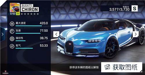 接下来介绍的就是布加迪Chiron,它是由法国跑车知名品牌布加迪出品的豪华超级跑车。在游戏中,布加迪Chiron最为抢眼的是其高达420.0的最大速度,想必大家都知道这个数字所带来的速度感。在看完布加迪的总体面板后,它的持久的高速让玩家能更好的在比赛中稳居第一,同时低的重心也可以让赛车在碰撞和做特技中能完成的更加出色。但唯一不足的一点,就是它的氮气相比于Fenyr SuperSport,还是稍有不足。