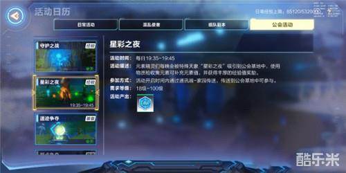 活动描述:元素精灵每晚会被特殊天气星彩之夜吸引到公会基地,使用物质枪收集元素,并获得大量经验。