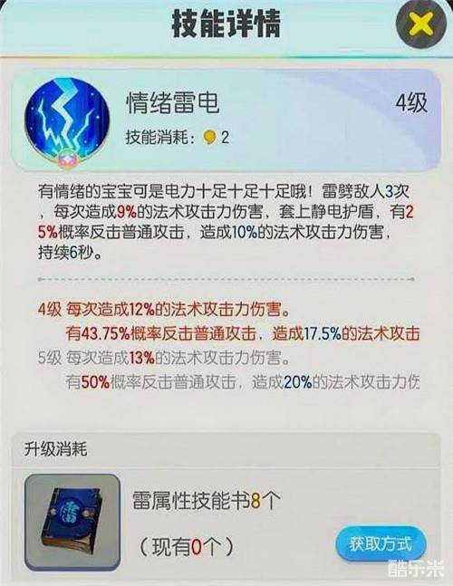 而进化成情绪雷电之后的效果为:造成三次法术伤害,并为自己施加一个静电护盾,护盾有一定的概率反弹伤害,造成自己一定比例法术攻击的伤害。