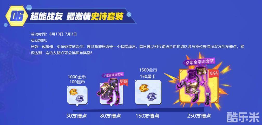在探险家驰骋于启明星之谷时,也别忘了把自己的现实好友也介绍给《堡垒前线》,一起开黑,默契满分!在活动期间,每位探险家都可以邀请一位好友绑定成为超能战友,每天通过相互赠送金币、组队参与排位赛等方式增加彼此的友情点。随着友情点的累积,就可激情解锁史诗紫金潮流套装等丰厚奖励!相信穿上这件象征着友谊的酷炫时装,你会成为整个启明星之谷最靓的崽!