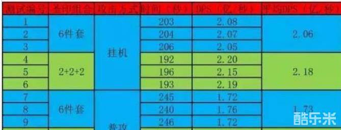 可以看到,尽管6件套组合攻击高,但DPS要低一点,2+2+2组合相比6件套DPS在挂机情况下提升5.8%,在普攻情况下提升9.2%。因此,PVE时,推荐2+2+2组合。