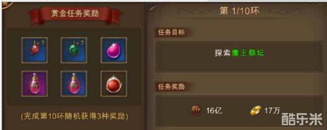 3、完成单个赏金任务会奖励大量经验和金币,金币奖励是所有活动中最优厚的。完成满10环后会从2级毁灭石、2级生命翡翠、魔仆精华、经验药水和坐骑丹中随机获得3种奖励。