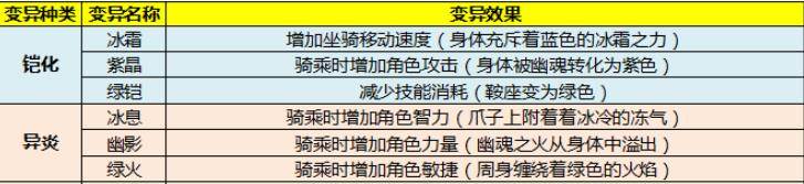 夜影狼骑拥有三个变异种类,每类中的变异状态可单独出现,也可多类状态叠加出现。如图所示: