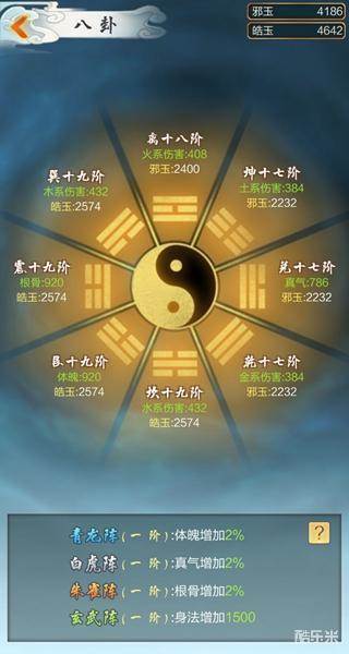 八卦则是天界中增强道友们基础属性的另外一种重要方法,类似于人间的灵池,需要的是“皓玉”“邪玉”两种素材,这两种素材也都是天界里获得的新要素。不同的卦象对应不同的五行属性,特定几个卦象还能组成青龙白虎朱雀四大阵,分别提升体魄真气根骨身法四大属性。