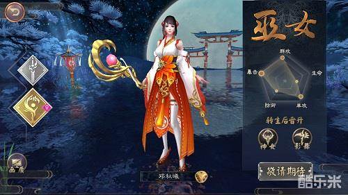 女性初始角色为“巫女”,使用法杖作为武器,是远程作战的法师,能大范围施法,可转职为“神女”、“影舞”。神女使用法杖,能使用自然的力量呼风唤雨。影舞使用镰刀,是近战法术职业,使用黑暗的力量挥舞镰刀,如同影子一般无声无息,在不经意间击溃敌人。