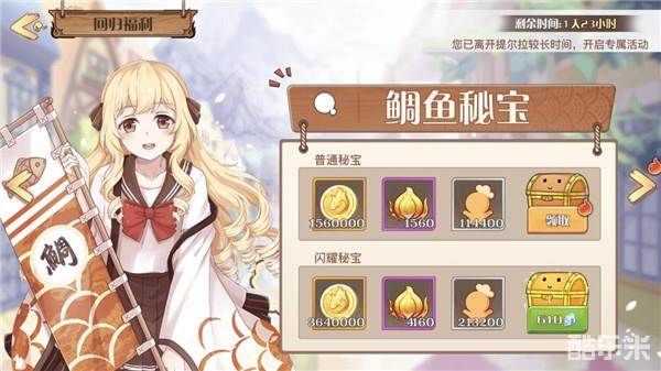 鲷鱼烧为许久不见的御侍大人准备的特殊礼物,可根据御侍大人离开的时间,获得对应的金币、经验和厨力,离开的时间越长,获得的奖励越多。御侍大人还可支付额外幻晶石,购买闪耀秘宝,获得更多奖励。