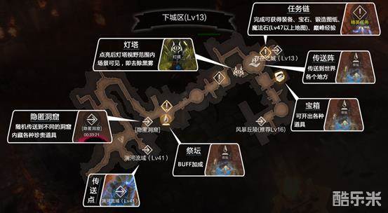 下面用大家最早接触到的下城区,来着重介绍一下地图中的各个玩法与功能点。