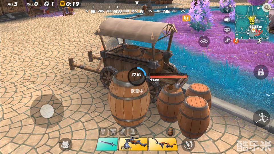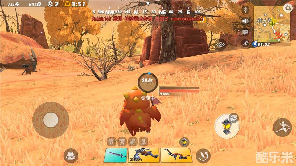 当玩家在激烈的厮杀中不幸血量归零后,不会立刻被淘汰,而是会变身成一只可爱的小龙,玩家可以继续操控小龙进行移动躲避,只要能够撑过30秒,就能原地半血复活,继续投入对战。如果你拾取了变身道具,还可以变成箱子、木桶、谷堆等道具,让对手无奈放弃。