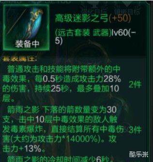 迷影套装的毒爆伤害只能使用攻击力增加,所以这套装备的核心就是增加攻击力,以一个匿名大佬的一万点攻击力属性来算(10000+2400+2500+2250+4800)*140*1.2=3687600点最高伤害,这个伤害是无视护甲的,按被动叠加速度基本每秒能触发一次;