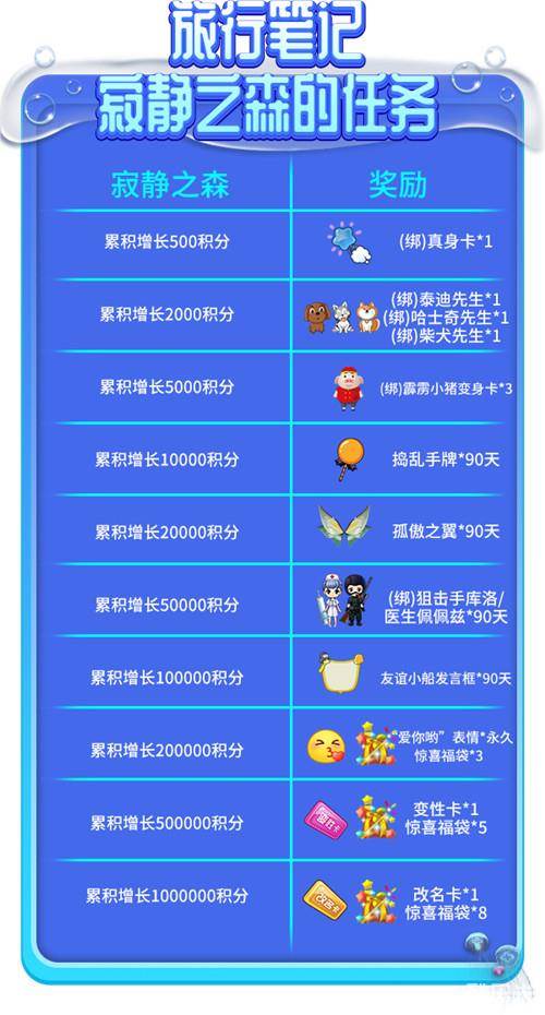去精灵群岛见证祈愿神树的魔法力量,去向魔法翻牌屋的老奶奶问好!沿途的风景美不胜收,超多的福利等你领取!活动期间,完成指定任务获得对应“旅行值”,增长“旅行笔记”的等级,解锁“旅行笔记”获得对应奖励!