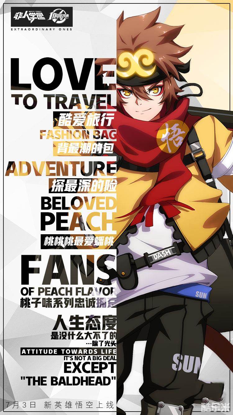 周年庆即将狂欢来袭,《非人学园》今日公布重磅消息,神秘英雄——悟空,将在7月3日破天而出正式上线!他是非都街知巷闻的传奇人物,他战斗力爆表,他走过许多不同的地方看过各异的景色,他就是悟空,他将在周年庆开启全新的冒险故事!