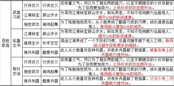 而烟雨江湖(代号江湖)二测中的出生天赋则有5种,分别为:1、行侠仗义:上场伙伴的攻击提升3%。2、闻鸡起舞:每场战斗增加10%的阅历。3、酷爱兵器:装备在身上的兵器威力提升5%。4、跋山涉水:提升10%的移动速度。5、妙手空空:每场战斗额外获取更多的银两。