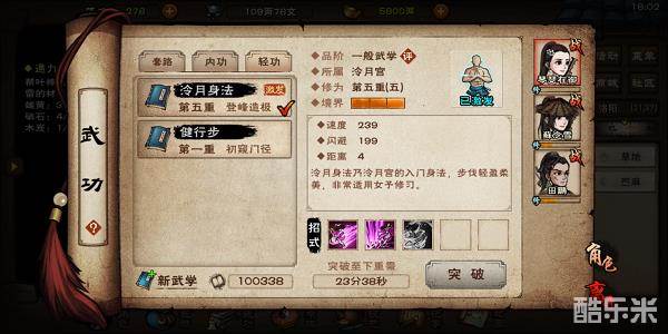 轻功主要影响着人物战斗时的速度与闪避值,在地图上也可进行相应的位移,从而到达一些地图的角落位置。轻功的等级也可影响人物在地图上的移动速度。