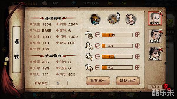 进入游戏后,玩家选择属性,可以查看角色的各项属性信息并且在升级后在此界面进行加点。