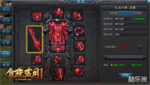 兵魂总共有14个位置,每个位置分别对应面甲、头盔、护肩、武器、衣服、项链、腰带、吊坠、手镯、护膝、戒指、鞋子,其中戒指和手镯各占2个位置。每个部位最高五品,每品有8个阶级,每升满8阶会自动升级到下一品质,这里要注意了,每个品质的激活是有条件的(兵魂界面的右边的问号可查看激活要求)。万劫装备部位没有太多要求可直接激活最高品质,每个品质升级需要消耗魂晶(每颗魂晶相当于2点魂晶值)或者星尘(每颗星尘相当于10点魂晶值),每个品质消耗的数量不同: